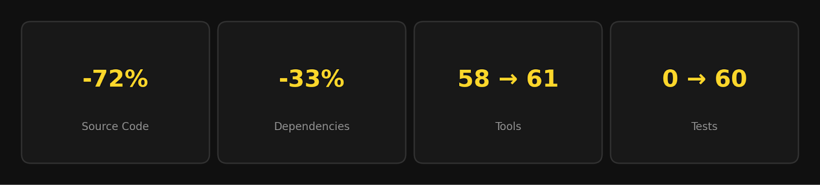 The result: tool coverage grew from 43 to 61 tools — not because we wrote more code, but because the spec had endpoints V1 never got around to hand-crafting. Account activities, order replacement, full option chain, do-not-exercise instructions, market movers, and more — all available in V2 because the spec described them, and the server read the spec.