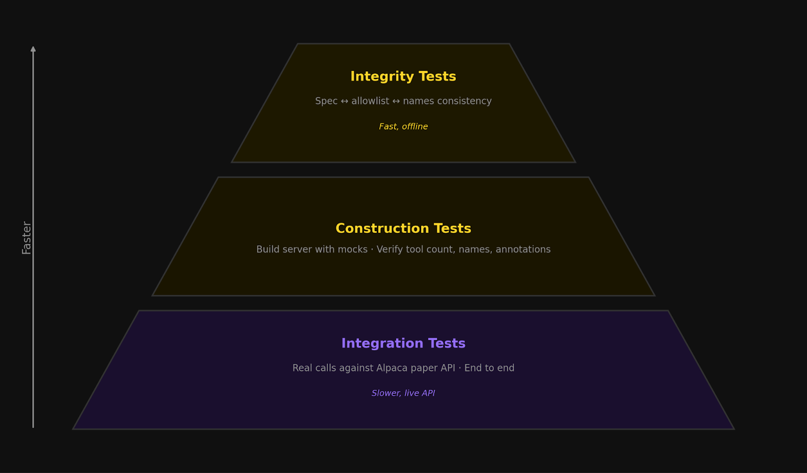 - Integrity tests: Verify that the toolset allowlist, tool names, and OpenAPI specs are all in sync.