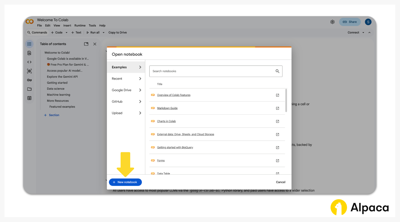 Open Google Colab and click the “New Notebook” button. This will initialize a Python environment for us to run the code in.