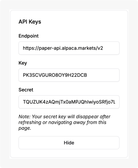 The Paper Trading API is offered by AlpacaDB, Inc. and does not require real money or permit a user to transact in real securities in the market. Providing use of the Paper Trading API is not an offer or solicitation to buy or sell securities, securities derivative or futures products of any kind, or any type of trading or investment advice, recommendation or strategy, given or in any manner endorsed by AlpacaDB, Inc. or any AlpacaDB, Inc. affiliate and the information made available through the Paper Trading API is not an offer or solicitation of any kind in any jurisdiction where AlpacaDB, Inc. or any AlpacaDB, Inc. affiliate (collectively, “Alpaca”) is not authorized to do business.