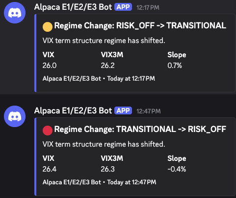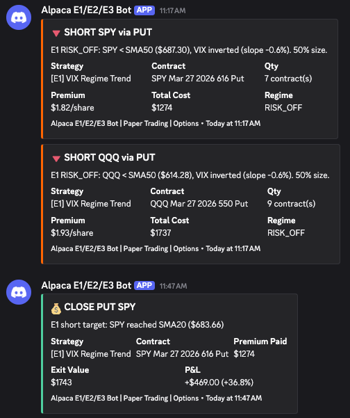 - Discord Webhooks are the notification layer. Every trade, every regime change, and every daily digest gets posted automatically. I check Discord instead of logging into trading platforms.