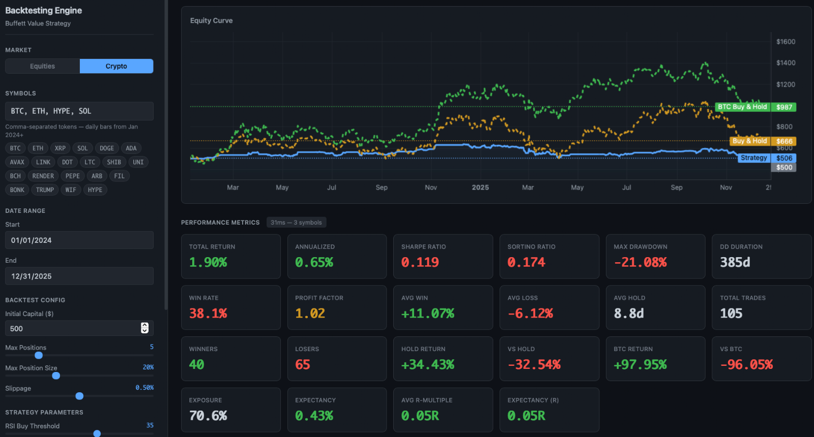 Over a two-year simulated backtest period (January 2024 through February 2026), the equity strategies showed positive returns over the tested period, with drawdowns that varied over time. The crypto strategies showed higher volatility but also higher absolute returns, which is pretty much what you would expect.