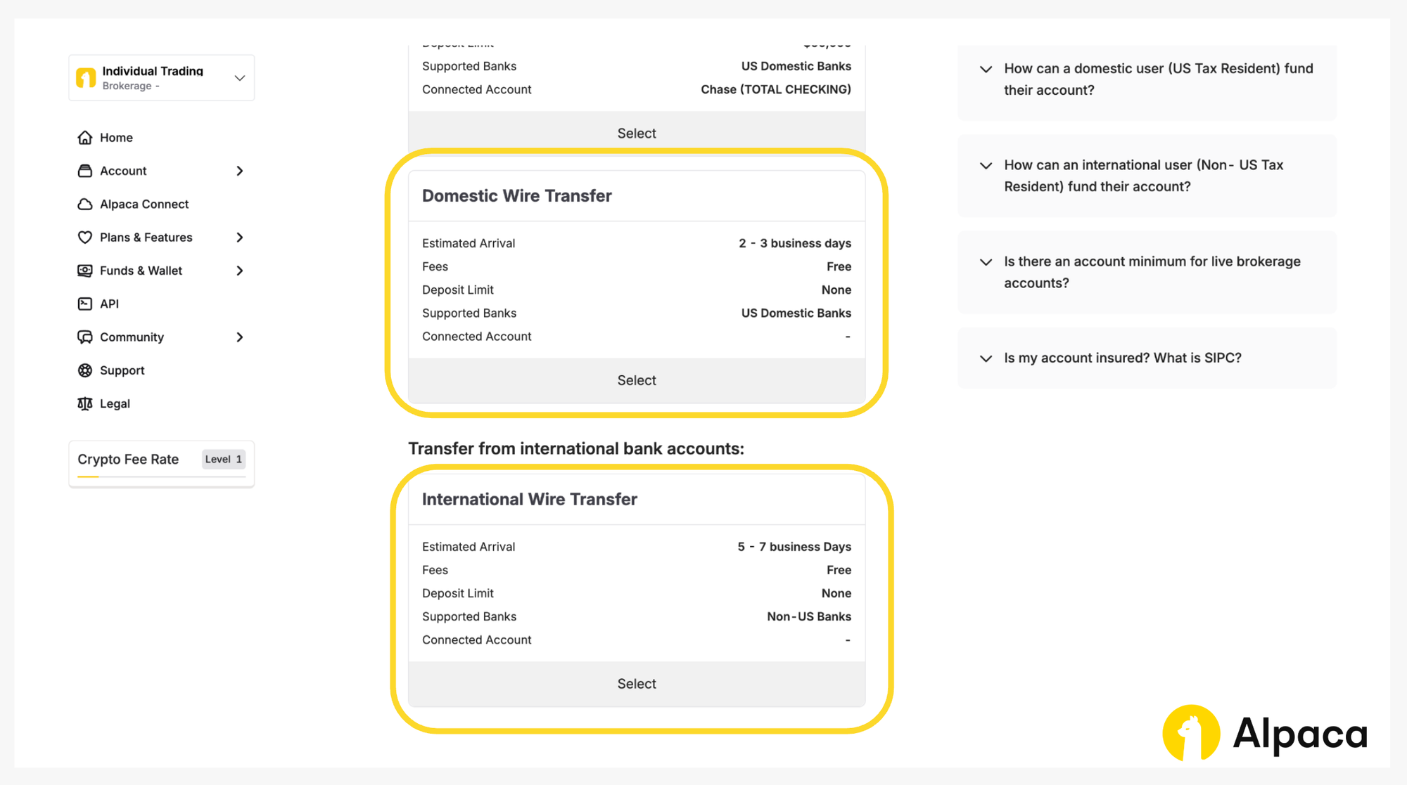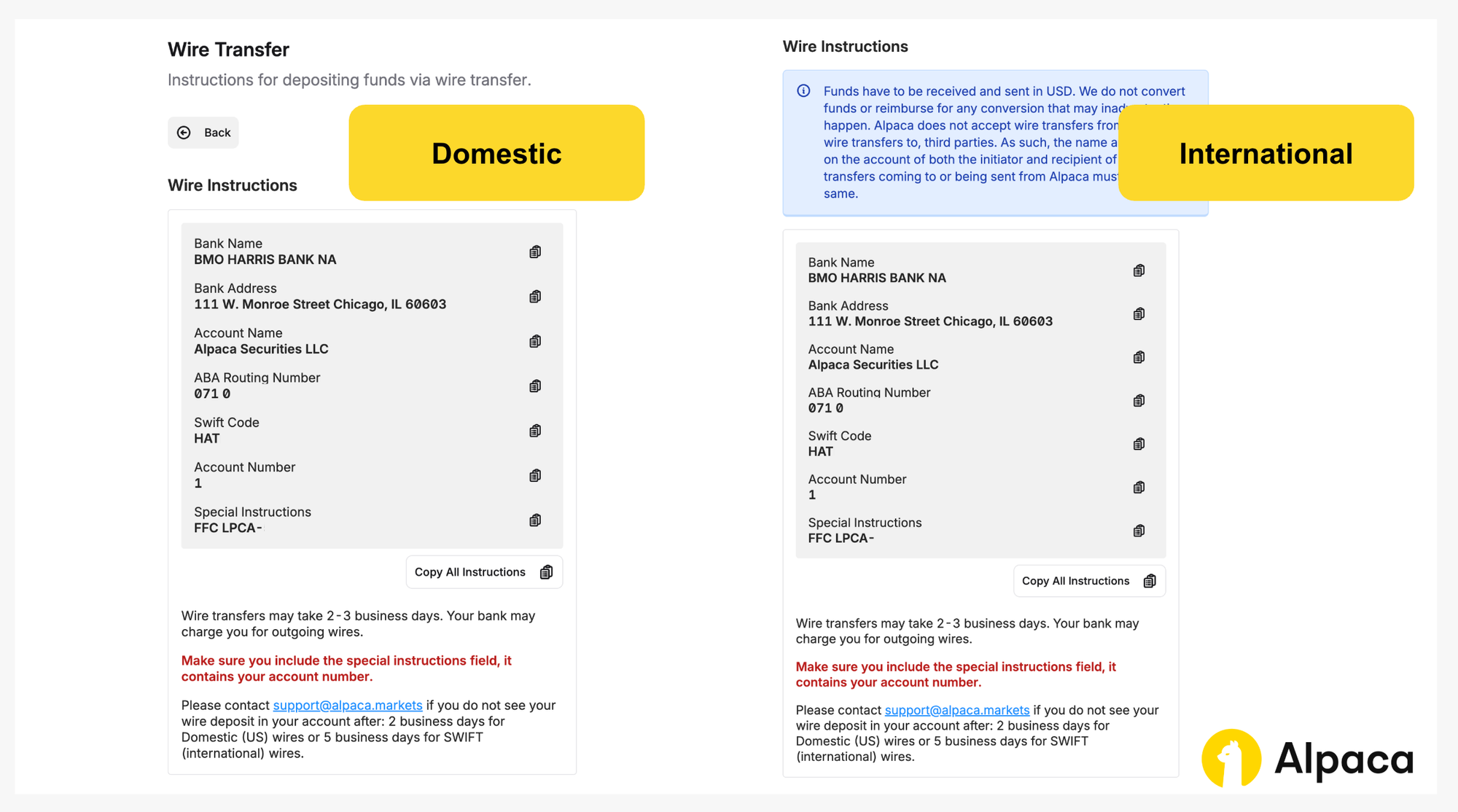 Note: If you are sending funds from an international bank, the wire must be sent in USD. Alpaca does not accept wires in other currencies. If your bank cannot send USD wires, we recommend using CurrencyCloud instead.