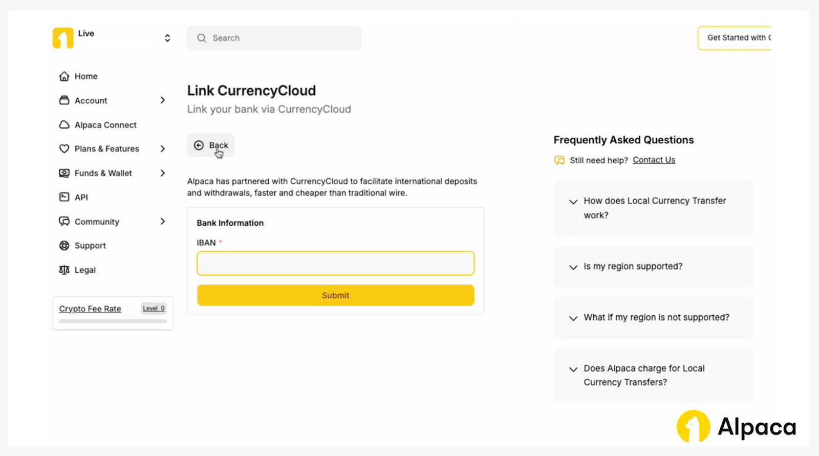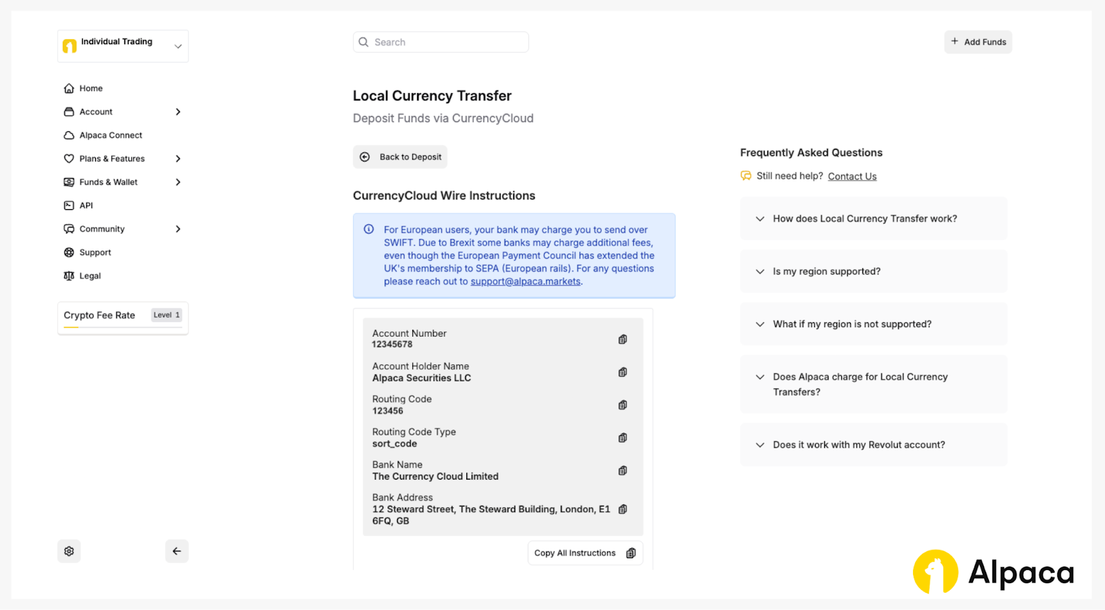 International users can send funds in their local currency to a CurrencyCloud wallet. Once converted to USD, the funds are deposited into the Alpaca's Trading API account available for trading.