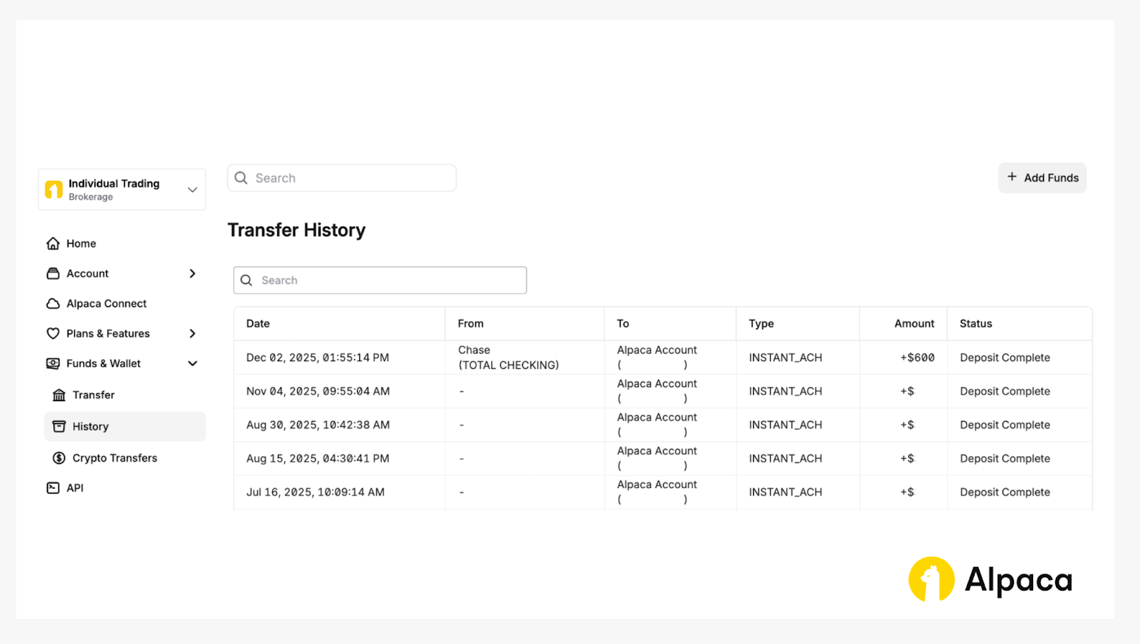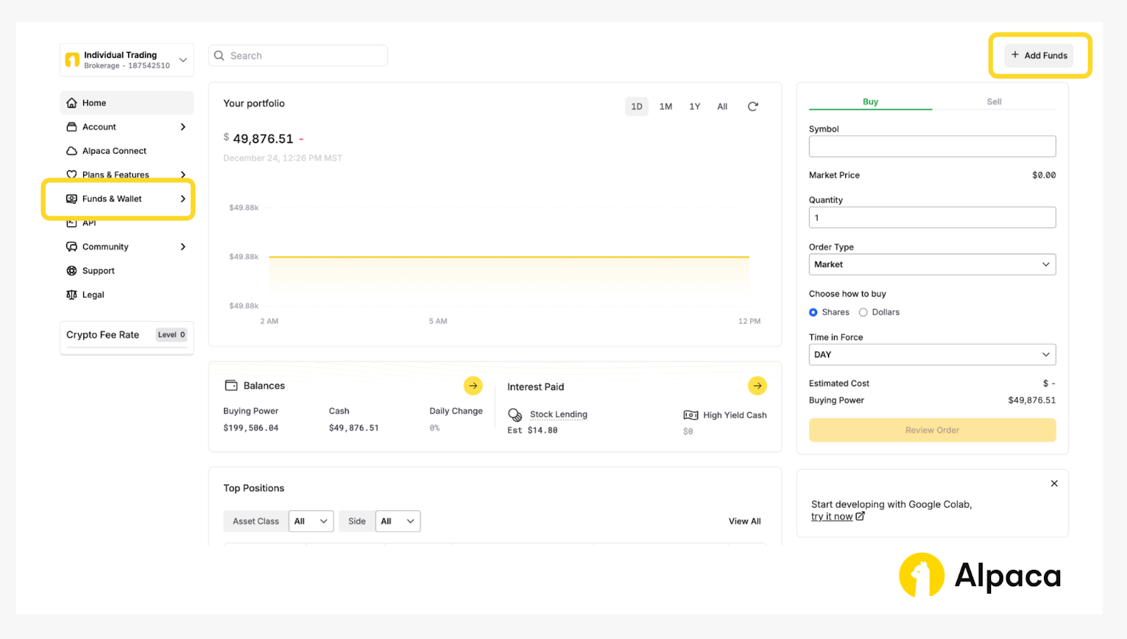 After logging in to your Alpaca account, go to the live trading account overview. Click the ‘Funds & Wallet’ tab on the left or the ‘Add Funds’ button on the top right to open the funding page. The account overview should look somewhat like the following: