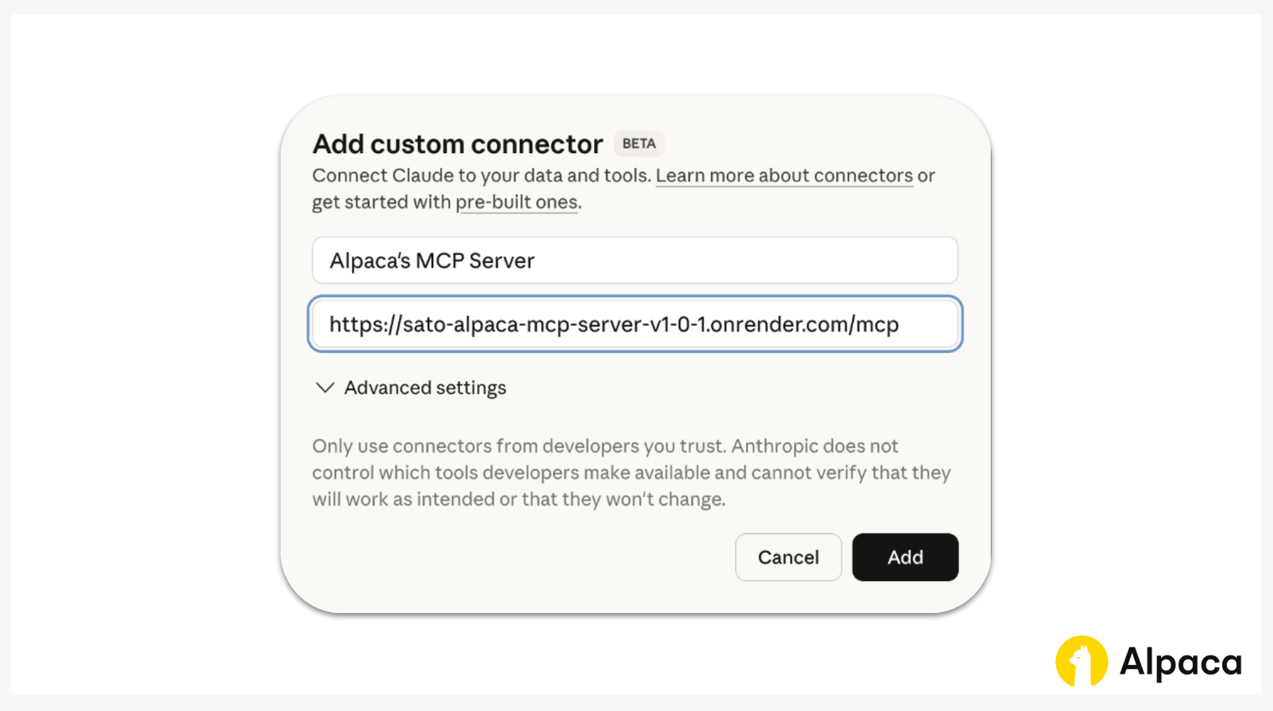 Step 3-1. Connect Remote Alpaca’s MCP Server with Claude Webpage