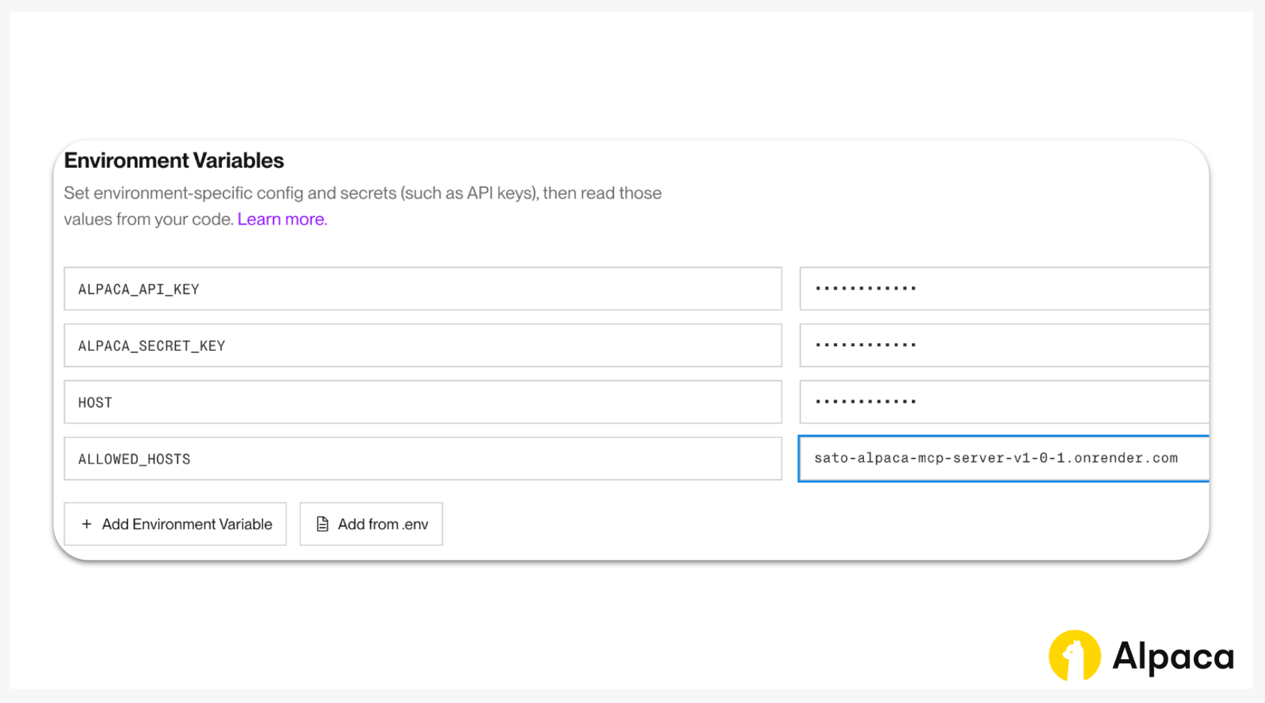 Set the environment variables for Alpaca’s MCP Server, namely, ALPACA_API_KEY and ALPACA_SECRET_KEY. Also set HOST=0.0.0.0 and ALLOWED_HOSTS=your-app-name.onrender.com (e.g., sato-alpaca-mcp-server-v1-0-1.onrender.com)