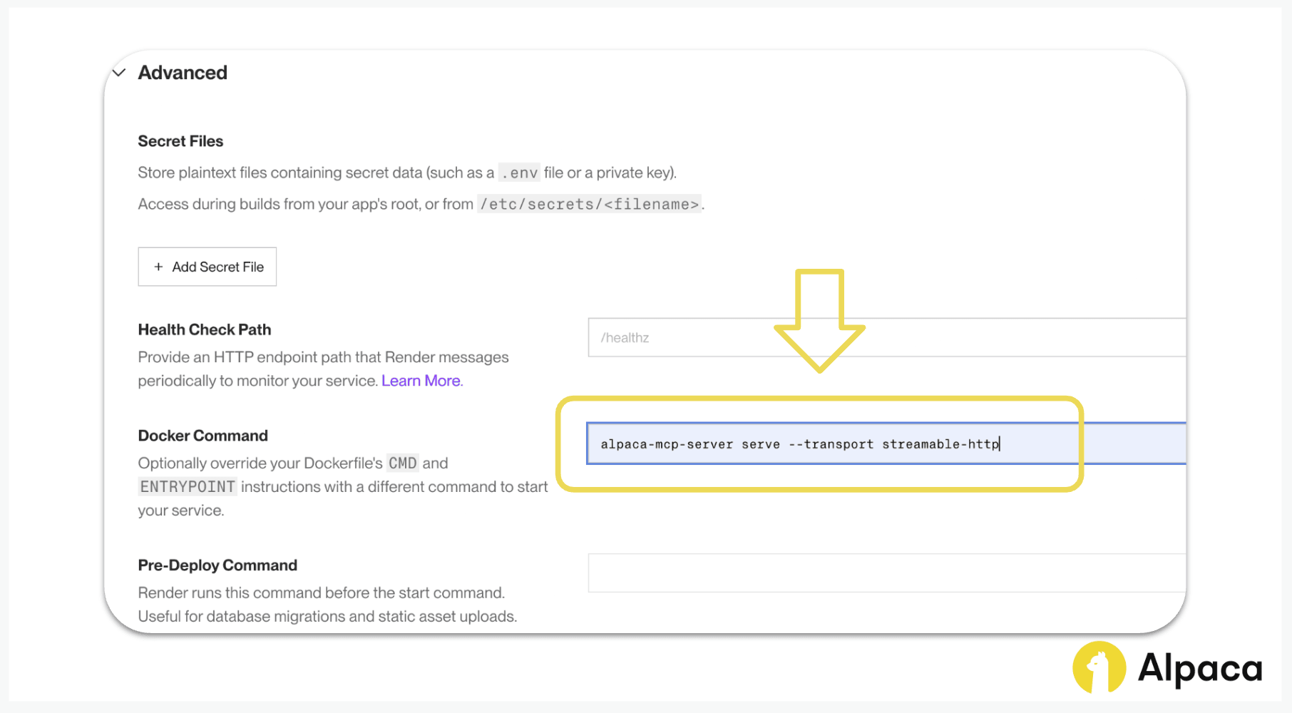 - Deploy the Alpaca’s MCP Server remotely using a cloud service