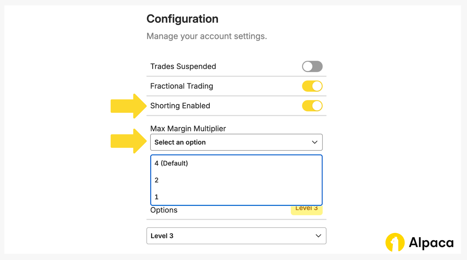 {'response_status_code': 403, 'response_text': { "code": 40310000, "message": "account is not allowed to short" }}To avoid this, confirm on Alpaca’s dashboard that short selling is enabled in the account configuration and that max_margin_multiplier is set above 1, subject to account eligibility and risk approval.